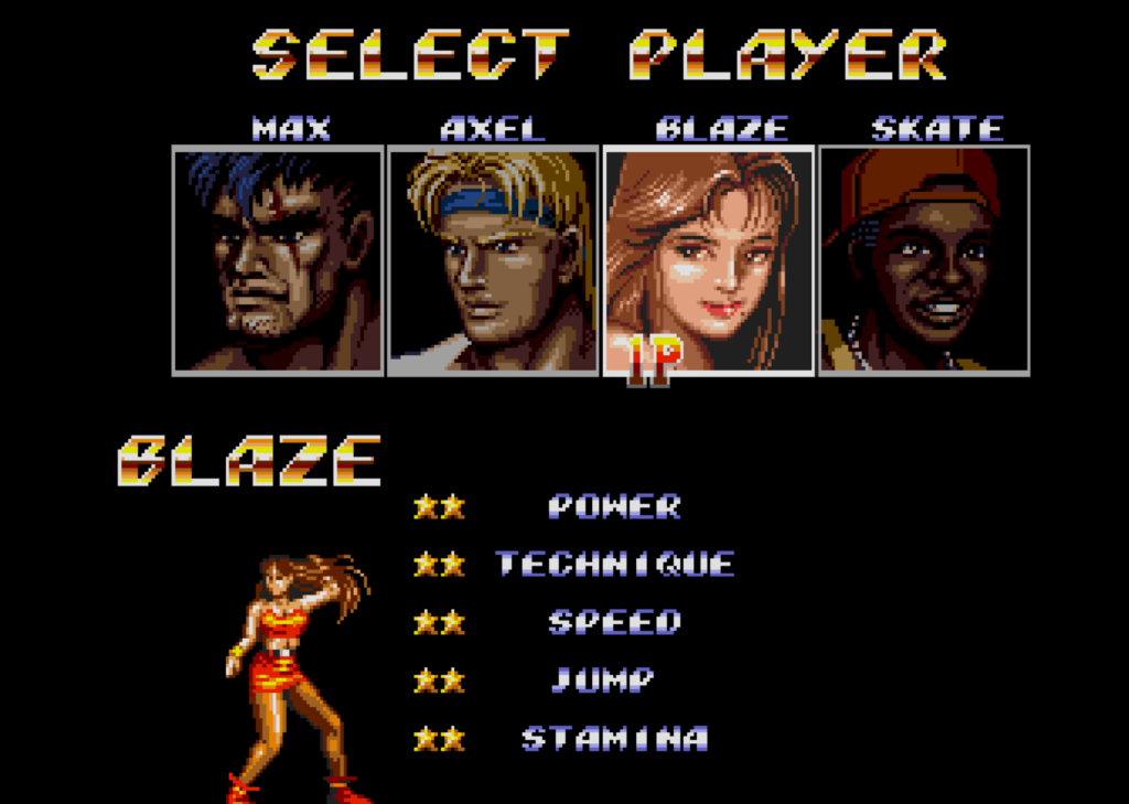 Axel, Blaze, Skate e Max, cada um com seu próprio estilo de luta.
