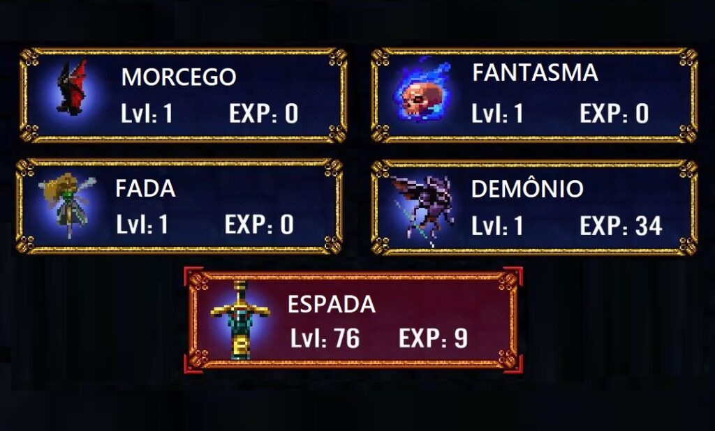 São elas: Fada, Demônio, Fantasma, Morcego e Espada.